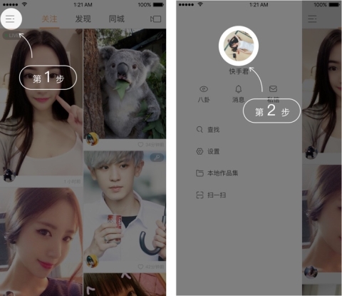 1、点击主页左上角的【菜单】按钮,点击用户头像进入个人主页。