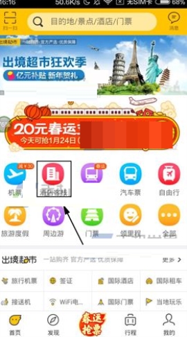 1、首先打开APP,点击【酒店客栈】,输入位置点击开始【搜索】。