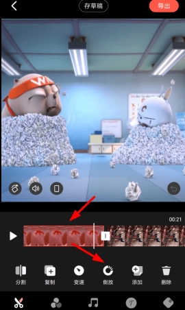 2、选择剪辑功能列表里的“倒放”特效,给选中的视频设置倒放效果。