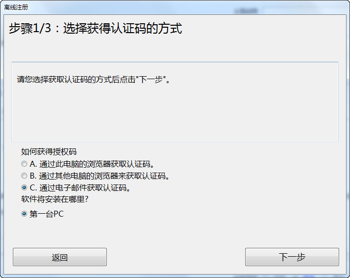 七 同时勾选 C "通过电子邮件获取认证码”和“第一台PC”这两个选项,点击“下一步”。