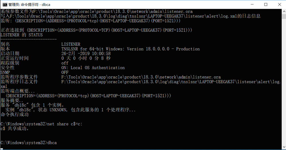 1、首先用管理员身份打开命令行,输入 net share c$=c: 并执行,然后输入dbca