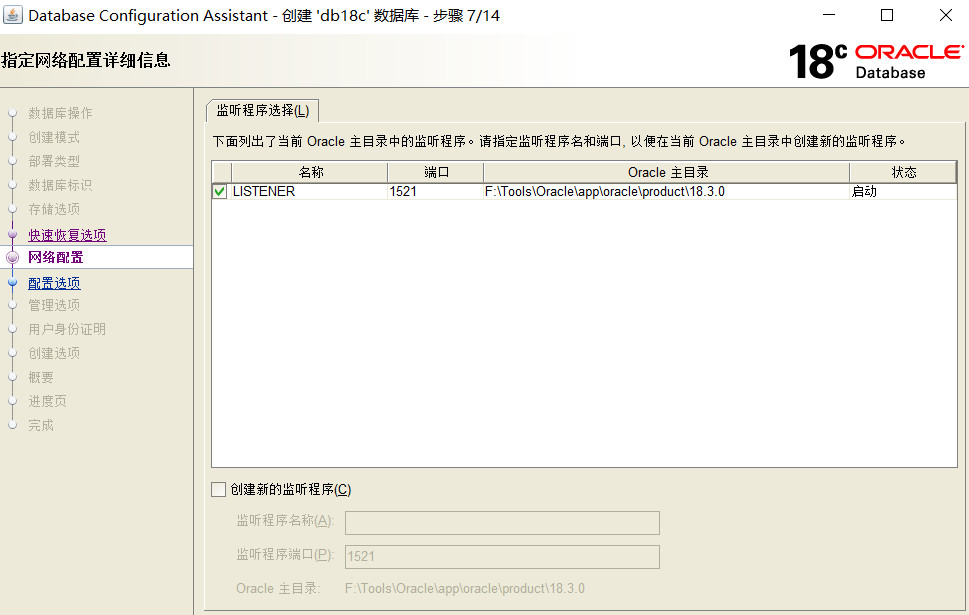 4、在配置界面,将全局数据库名和SID设为"db18c",oracle主目录设为一开始软件解压缩目录(即"xxx/app/oracle/product/18.3.0"),至此监听程序设置完成。