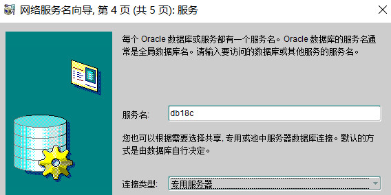 8、服务名填写"db18c",连接类型选择"专用服务器",点击下一步完成配置