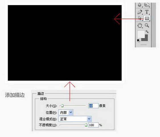 1、首先用矩形工具画一个矢量框,并给这个矢量框添加10像素的白色内部描边。