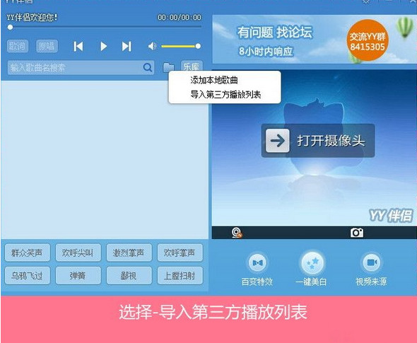 YY伴侣是一款新出的虚拟视频软件,许多网友还不是很会使用,其实YY伴侣的使用方法很简单,它不用再麻烦的打开其他播放器来找歌了的软件,该软件内置了海量歌曲伴奏供您免费使用!丰富的特效、图标、音效让您百试不厌。为了您的YY生涯,有需要的朋友就把yy伴侣下载回去吧!