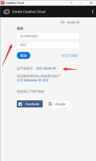 软件会自动打开,如果你的电脑是第一次安装Adobe软件,那么他会提示你登录你的Adobe账号,如果没有账号可以点击获取AdobeID进行注册一个。有账号登录之后就可以进入PS界面。
