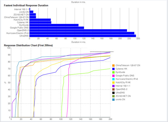 测试完成后,Namebench全以图表方式显示出测试报告,并按速度顺序对所测试的DNS服务器进行排序。