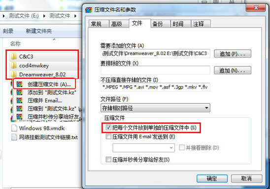 右击多个文件或者文件夹,选择"创建压缩文件(A)…"菜单项,在参数设置框内"文件"选项卡,勾上"把每个文件放到单独的压缩文件中",则会自动压缩单独的压缩包,等同于批量压缩^_^。见图4