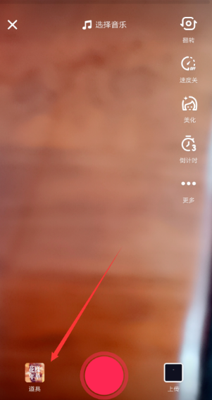 在抖音的拍摄界面里直接点击左下角的【道具】,如下图所示。