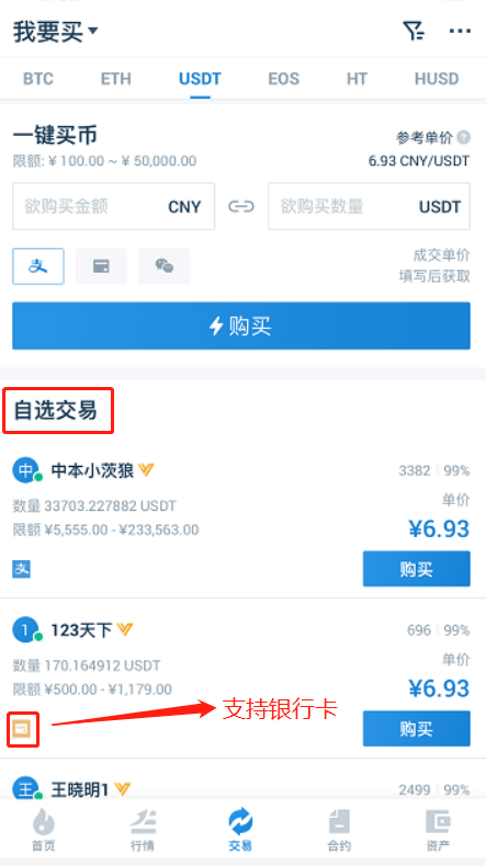 除了“一键买币”之外,您还可以“法币交易”页面选择“自选交易”,可以使用银行卡购买虚拟货币。