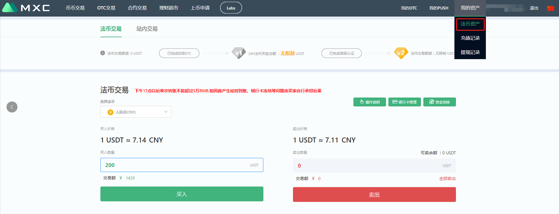 1. 在“法币资产”查看已购买的USDT,通过“账户划转”将法币资产转移至币币资产以购买比特币
