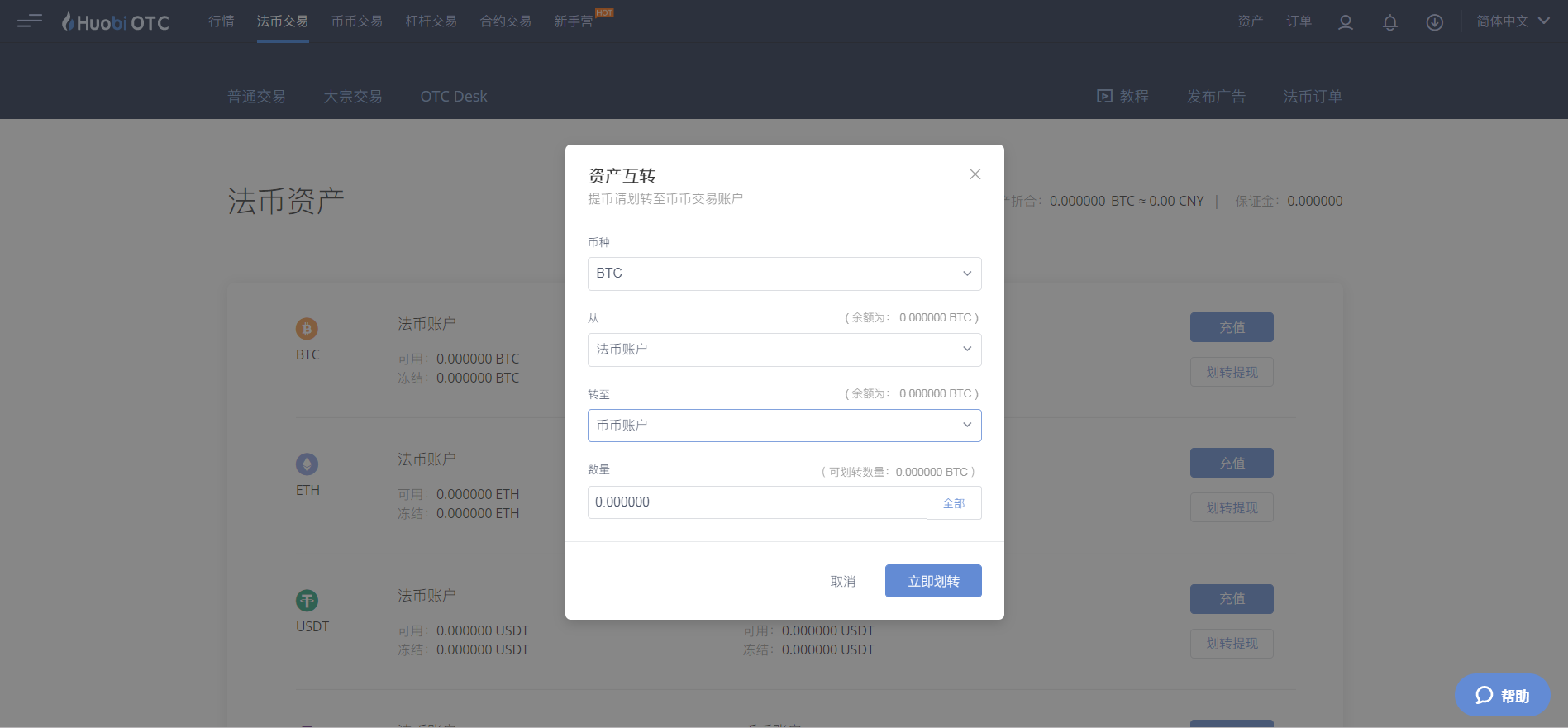 2、点击“划转体现”,输入需要划转的币种数量,点击确定即可成功完成资产互转。