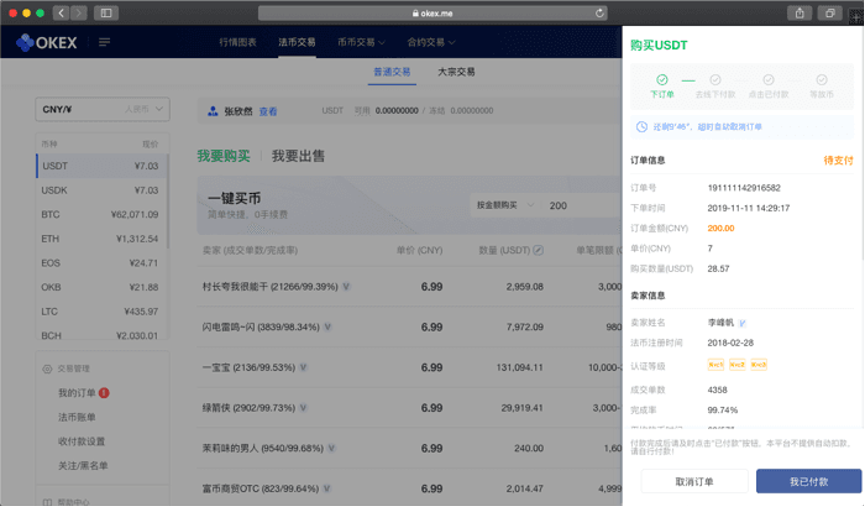 2、点击去法币页面,选择【一键买币】,最低10元起。在【一键买币】首次200-1000元的数字货币,将获得20元BTC的新手奖励。