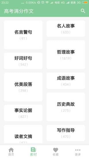 2、写作素材:包含诸多子分类如:写作指导,名言警句,名人故事,哲理故事,好词好句,优美段落,成语故事,历史典故,实时论据,读者文摘等.让你在提高作文水平的同时,还扩展了你的知识面.