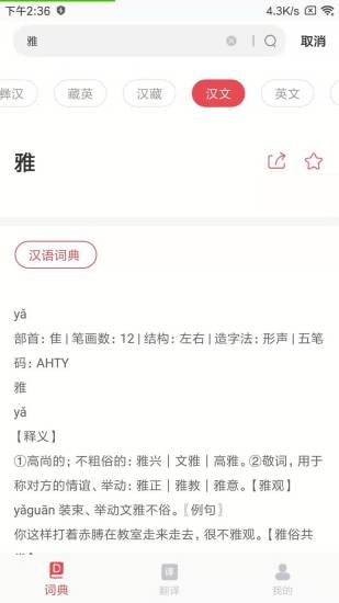 收录权威词典,本地10万词条,云端500万词条,联网情况下还有网络释义、同反义词、例句和百度百科等丰富结果