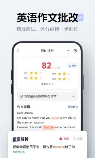 基于AI技术的英语作文批改功能。一键上传照片,自动识别作文内容;专业评分,与多种考试评分标准对齐。