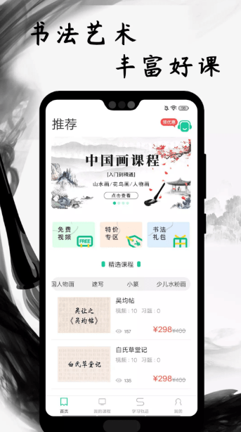 书法艺术学习平台汇聚多种书法知识,铅笔字,钢笔字、楷书,隶书、毛笔等应有尽有,并且还覆盖中国画,篆刻、速写,色彩等多种课程内容,只要关于书法方面的知识课程都可以在这里找到;使用app线上学习也十分方便,并且价格优惠,无需线上寻找培训学习以及专业老师,自己在家也能学,还能配合学习进度轨迹,定制个性化学习方法,真正的想学就学。