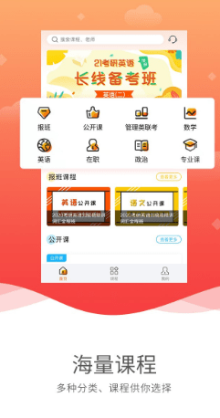点播课程:支持数学、英语、管理联考、政治、专业课、在职研、题库、公开课等八种课程的服务;