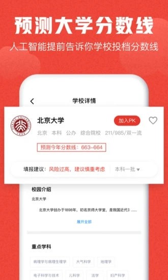 测录取概率:结合高考成绩和院校历年录取数据、高校录取难易度排行,帮助考生提前预测院校录取概率,控制落榜风险。