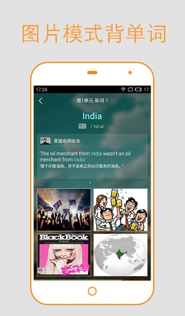英语背多分app人工编辑及从听力文章撷取的例句与其发音和图片加深记忆。