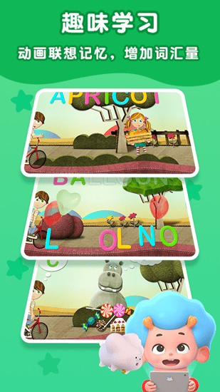 联想记忆字母,这里设计了趣味的动画片帮助孩子加深对字母和单词的记忆;