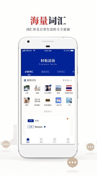 法语学习app是一款学习法语的软件,这里有非常多的词汇,语法讲解还有中法文章对照翻译。你还在苦苦找学习法语的软件吗?这个实用性很强的,还会和你分享法国的当地风俗,来试试吧!!