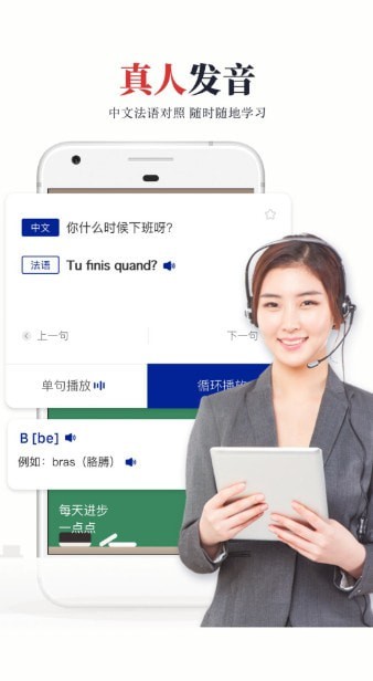 2.真人教学:由留学法语,教学经验丰富的专业法语教师实际教学,如同课堂的上课体验,让您学习精准的发音。