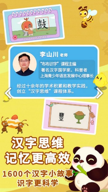 布布识字app采用结构记忆法,将汉字拆分解读。从字源讲解,有理有据。以字根构建常用字,以常用字构成语汇。