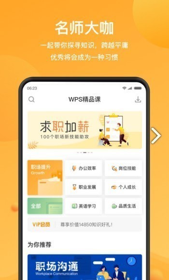 WPS精品课是一款专为职场人士提供优质内容平台。涵盖职场办公效率、岗位技能、职业发展、个人成长、英语学习、品质生活等诸多精选内容,为每个职场人士提供优质的方法论来帮助大家解决问题。