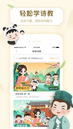 用游戏化的闯关界面,呈现丰富的学习内容。学诗得诗心,点滴进步随时可见,激励孩子自主学习。