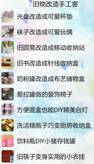 旧物改造手工制作大全app是一款专注旧物改造的手机应用,含有多种旧物改造方案,提供想起的制作步骤,帮助用户轻松从零基础变成旧物改造达人,利用身边任何可以利用的旧物立马就能改造成家庭用品,赶紧下载软件动手做起来吧!