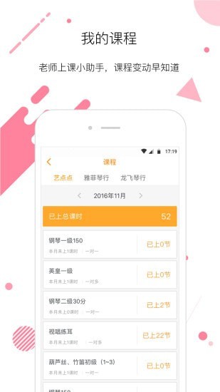 “艺点点”琴行管理软件是专为课外兴趣教育培训设计的,集教务管理、教学辅助、招生宣传于一体的互联网跨平台智能软件,适用于大中小各种规模的课外培训机构~~快来加入我们吧~