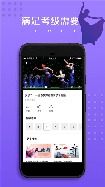 中国民间舞蹈很主要的一个特点,就是舞蹈与歌唱的紧密结合。这种载歌载舞的形式,自由、生动、活泼,可以比纯舞蹈易于表现更多的生活内容,而且通俗易懂,所以非常为中国广大人民群众所喜爱。巧用道具,技艺结合。中国的很多民间舞蹈都巧妙地使用道具,如扇子、手帕、长绸、手鼓、单鼓、花棍、花灯、花伞等等,这就大大地加强了舞蹈的艺民族舞术表现能力,使得舞蹈动作更加丰富优美、绚丽多姿。镜面,镜像,慢放,慢速播放,AB区间循环播放,视频提取音频,课程分解教学,热门,流行,零基础,你轻松学会。该APP软件是简单易学的舞蹈神器,免费好用的跳舞神器,0基础的学舞神器,艺术,教育,音乐,瑜伽,美术,钢琴,游泳,跆拳道,运动,任何兴趣、任何技能都可以有!