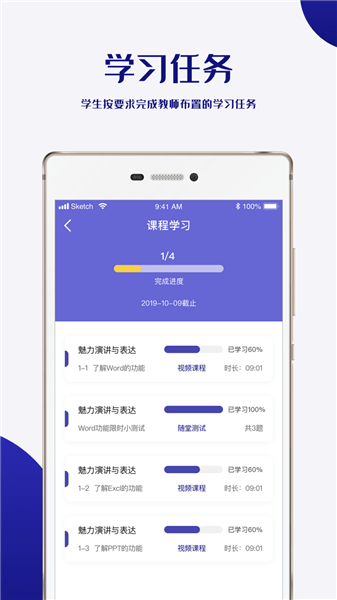 2、学习任务功能:学生可完成课程学习、随堂作业、随堂考试三种不同的学习任务,获取完成进度