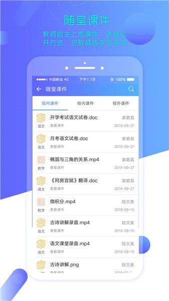教师上传随堂课件,实现班班通跨越校校通,提高师生课堂效果,整合全国教育资源,实现教育资源共享,优势互补。