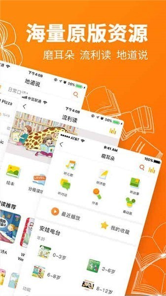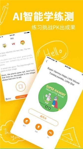 磨耳朵-听儿歌/绘本/口语音频,情境对应-看动画/绘本/场景画面,练口语-朗读/角色扮演练/挑战PK