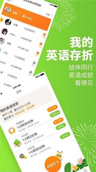 记录、统计、生成磨耳朵/阅读/口语存折,可录入其他设备数据;课程表功能帮助孩子学习规划并监督执行;AI评分功能,花蜜、金币奖励;广场晒作品,荣誉榜排名,参加活动奖励等