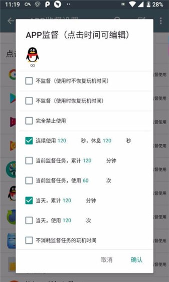3、「APP监督」对每个APP都可以单独设置使用时长、休息时长。