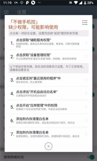 首先需要权限,在弹出的检测权限页面设置好需要的权限,手机控才能正常运行监督,如果没有弹出,在“设置”,“立即检测权限”中