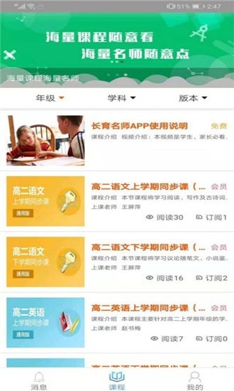 长育名师app为小、初、高不同年级的学生提供在线名师辅导的平台,用户下载应用、注册登录账号、开通会员后即可免费观看所有年级的课程视频。用户可关注自己感兴趣的讲师,该讲师发布新课程视频时有消息提醒。