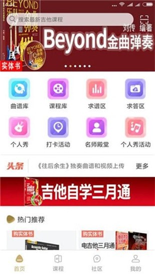 进入首页,从曲谱库和课程库中选择吉他学习资源
