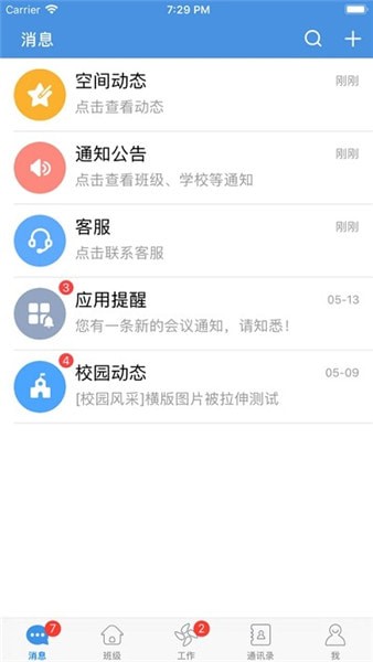空间动态、通知公告、客服、应用提醒、校园动态