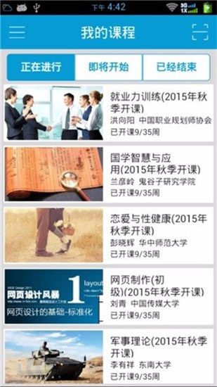 系统将课程分为正在进行、即将开始与已经结束三类课程;