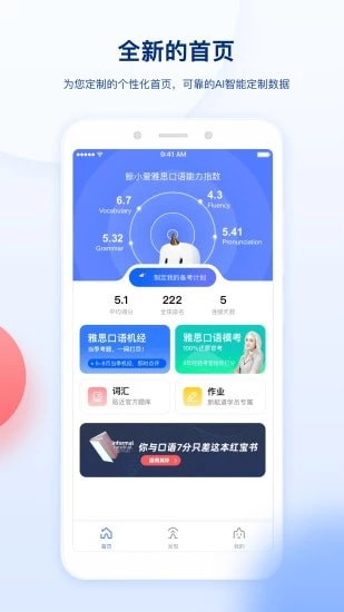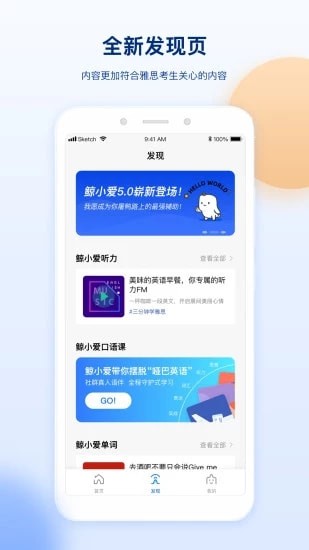 5-10分钟,快速测出你的口语水平,在鲸小爱的引导下,通过听力理解,情景选择,跟读、复述,科学量化你的口语能力,并给出专业全面的评测结果。