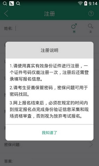 (2)请考生务必牢记注册时设置的“密保问题”与“密保答案”,这两项信息是登录密码丢失后考生自行找回密码的重要验证项。
