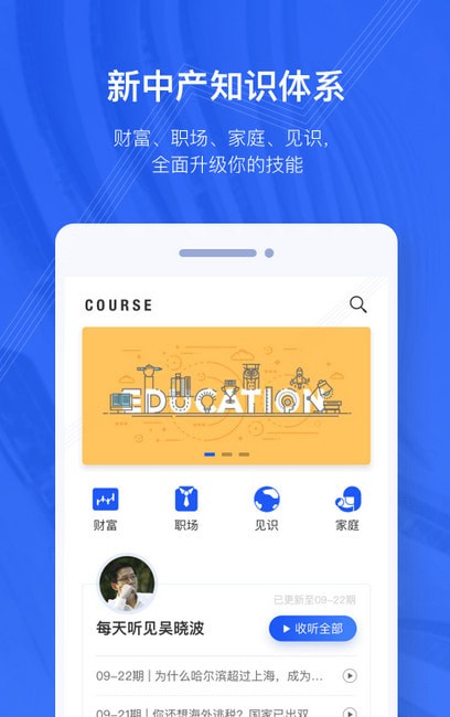 吴晓波频道app是一款专注服务新中产人群的课程学习平台,为新中产提供工作和生活中必备的新认知和新技能。从财富、职场、家庭、见识四个内容方向,结合线上课程与社群训练营的方式,让用户更高效地获取知识,形成自己的认知体系。
