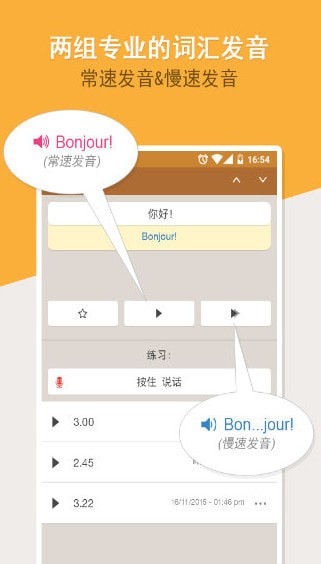 法语常用语手册app提供日常问候、交际、购物等用户,可以选择语速的快慢,在线进行跟读学习.也可以自定义词组学习,同时提供汉语直译,帮助理解学习!