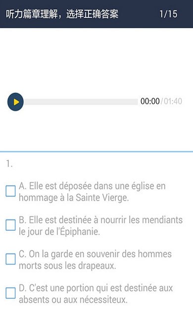 • 最全真题:目前,法语考试的真题题目稀缺,得到真题题目的渠道极其有限。蜗牛法语题库收集了各类考试海量真题。免去搜集真题的烦恼。