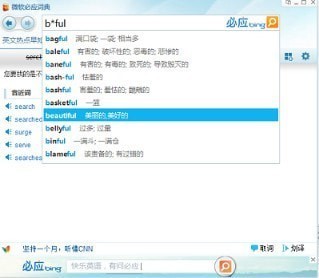 查询beautifp时,在输入框输入键入b*fp,或者在输入框输入键入bea?tifp,必应词典都会给出可能的建议及相应的中文解释。
