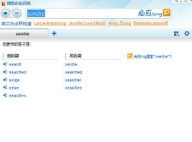 查询search时,错误地输入为serche。必应词典无法找到对应的词条,会给出可能的建议。